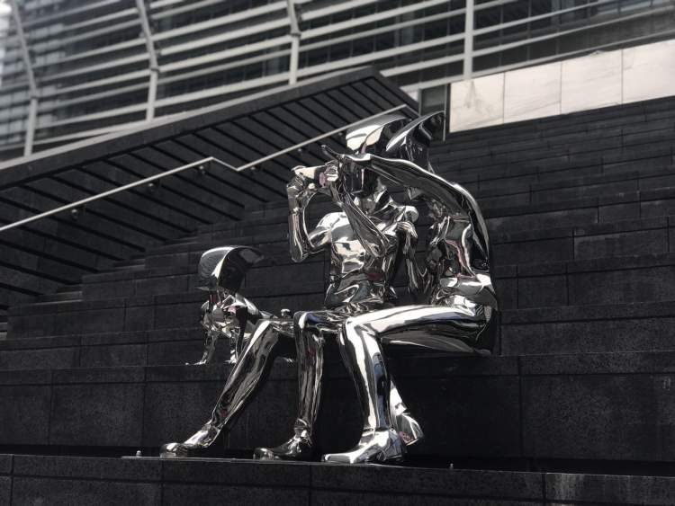 下沉式广场上的阶梯,有金属质感的雕塑,拿着手机正拍照呢~