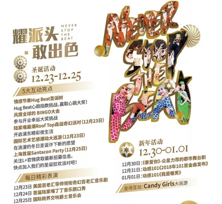 比如圣诞活动就包括Hug Beat圣诞树、屋顶派对等等,元旦前还有舞台剧、Candy Girls大巡游!