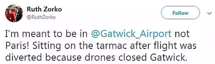 “什么?降落在巴黎而不是盖威克?如今坐在跑道上等待,因为无人机事件,盖威克关闭了。”