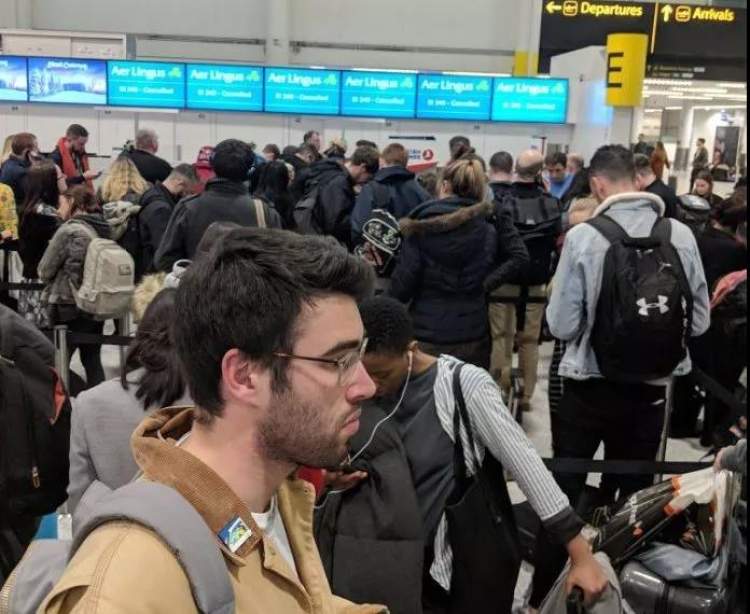 “我一个朋友给我发了一条短信:他的航班被疏散到曼彻斯特机场,目前坐的疏散大巴也堵在路上……梦想假期破灭!”