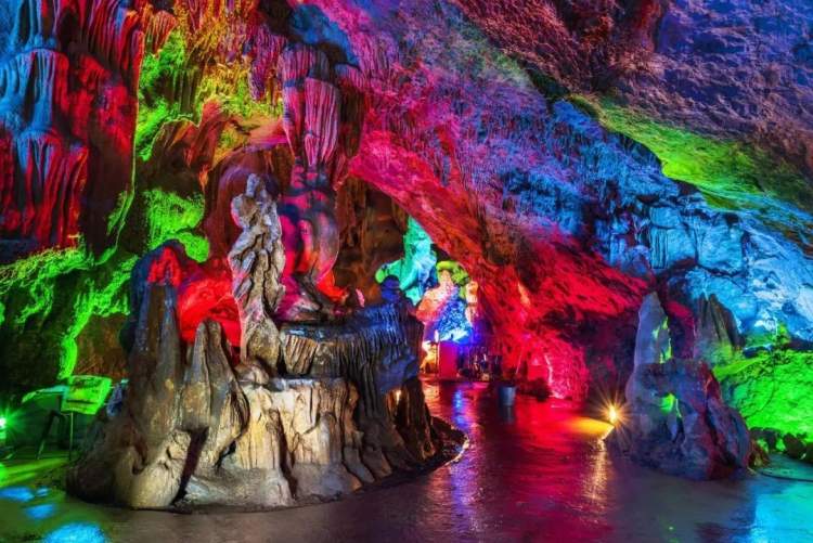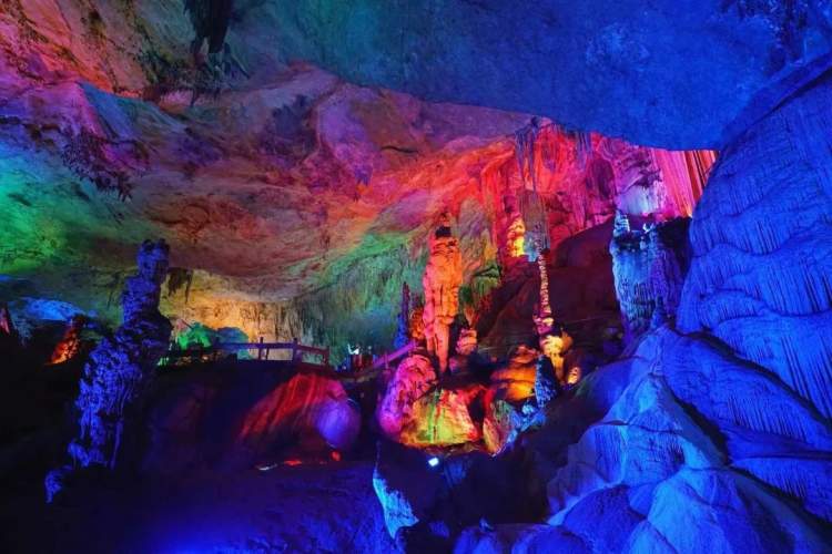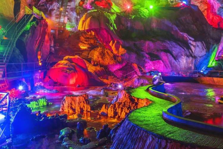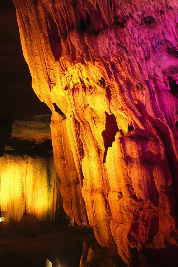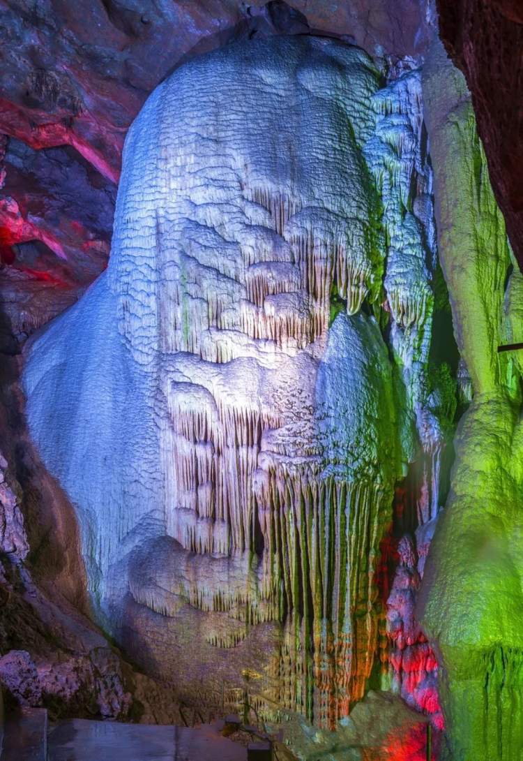 通天飞瀑位于胥口镇,处于杭州至千岛湖黄金旅游线的中段。洞内景观千姿百态,五颜六色,迂回曲折,雾气氤氲,真让人叹为观止,美不胜收。钟乳石倒三角形尖儿还滴着水。借水流“雕刻”而成,不同花纹形状,配上五颜六色的光照,亮晶晶金闪闪。