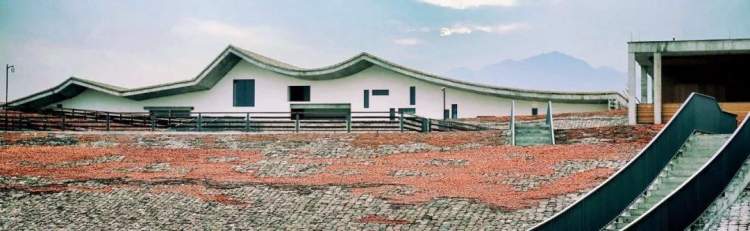 站在建筑群顶部俯瞰,可见山坡形的屋顶、小桥状的走廊,和身后绵延群山融为一体,彷佛就是黄公望《富春山居图》的一个局部。从入口处往深处走,别有洞天,绵延百里的用竹子与混凝土浇筑成了富春山馆独特的建筑肌理。