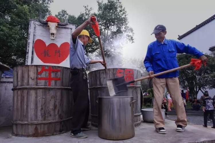 △掏牛锅是龙门特有的饮食文化。当人们还在酣梦的时候,龙门古镇的校场上已经升起了袅袅炊烟,三口大锅升上柴火,大锅里有龙门人独家秘制的高汤,炖上三个大牛头和牛胴骨,旁人还未走近,就已是十里飘香。一大锅的“掏牛锅”配以香醇可口的龙门米酒,也吃出了“滚滚长江东逝水,浪花淘尽英雄”的快意。