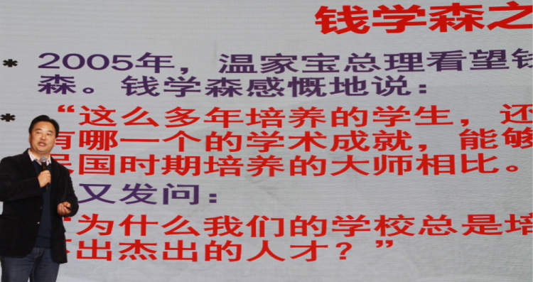 讲座的一开始,刘强就提到了著名的钱学森之问:“为什么我们的学校总是培养不出杰出的学子?”