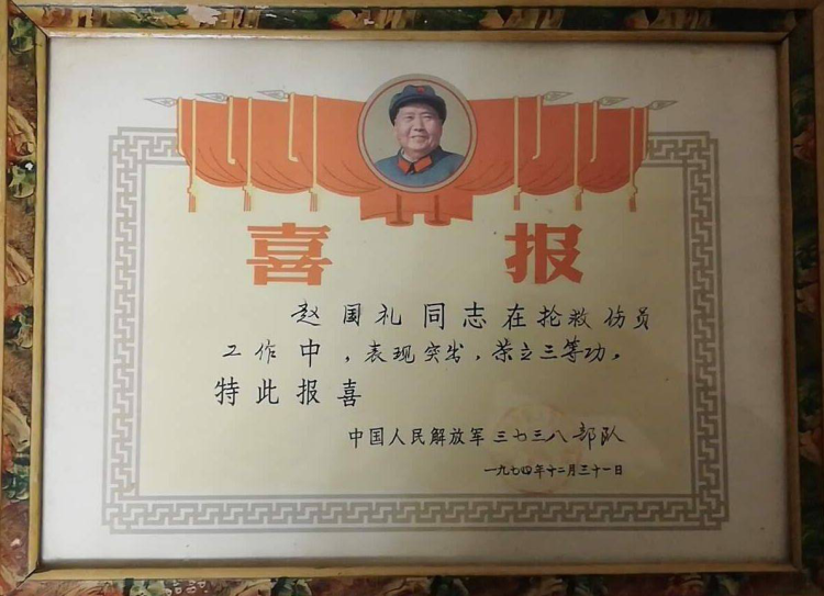 “姥爷年轻时是一名航医,在兰州军区奉献了他的青春岁月。在一次演习中,一架刚降落的战机机舱温度过高,开始冒出黑烟。姥爷立刻觉察到了即将发生的危险,飞奔过去,拉出飞行员,赶紧架着他脱离了危险区域。随后发生了爆炸,灼热的碎片在姥爷脸上留下了一枚英勇的‘徽章’。姥爷也因为在千钧一发之际救下了那位飞行员受到了表彰。我是2000年出生的大学生,从小就立志长大后能够成为像姥爷那样对国家和社会有贡献的人。”