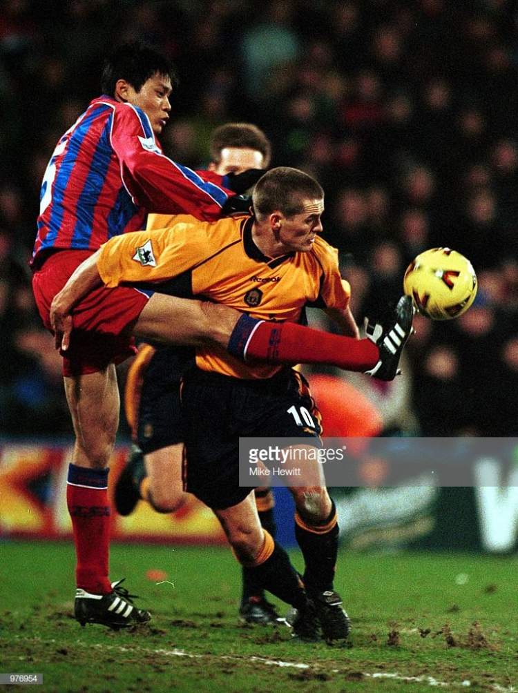 这是2001年3月6日,水晶宫主场对伯明翰的英甲联赛中,迪恩·奥斯丁和范志毅“双鬼拍门”,由奥斯丁头球破门的瞬间。