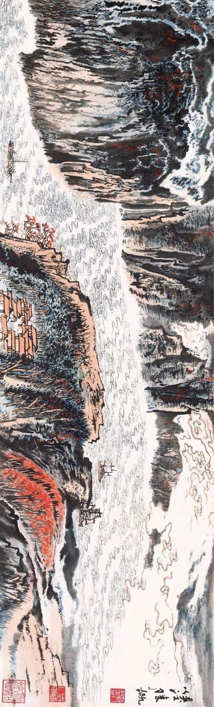 多年以后,忆及这段经历,经笔墨淬炼,陆俨少创作中的现代审美气息和激越的时代感越发强烈,重画峡江云水时,疾流奔泻、崩滩裂岸、飞沫堆雪的“陆家云水”便已喷薄而出。