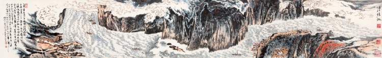 这幅画是陆俨少先生最经典的峡江题材《峡江胜概》,尺幅为30.3×202cm,大概是6平方尺大小。这幅画在预展时,就有许多人站在画前看了很久,甚至说,看了这幅画,以前看过的陆俨少峡江题材作品都不用看了。