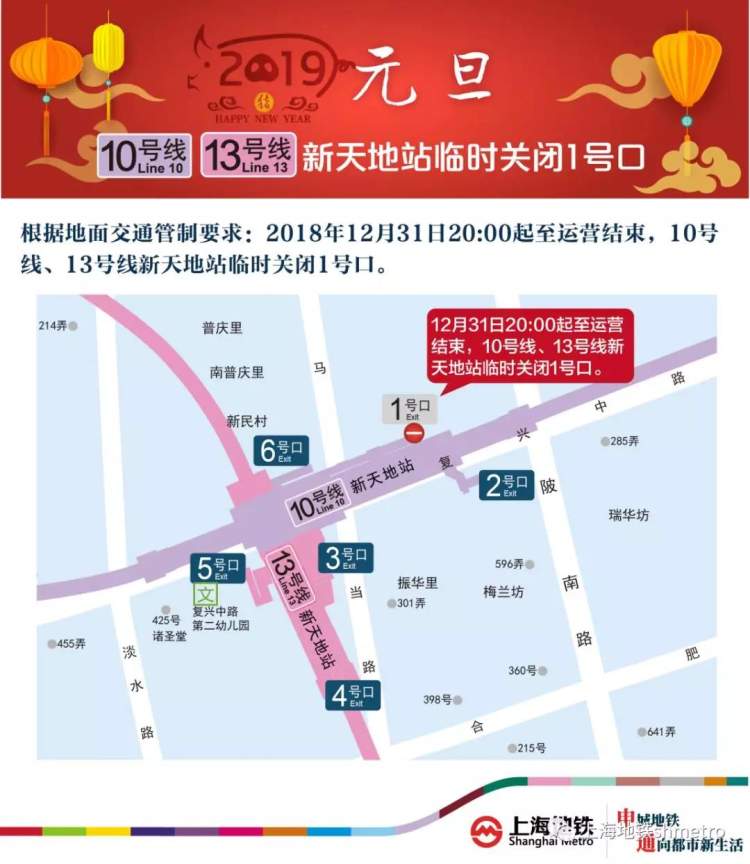 同时,10、13号线新天地站将于12月31日当晚20:00至运营结束,临时关闭1号口。届时,车站将加强客流引导,并在1号口外设置导向,引导乘客从该站其他出入口进出站。