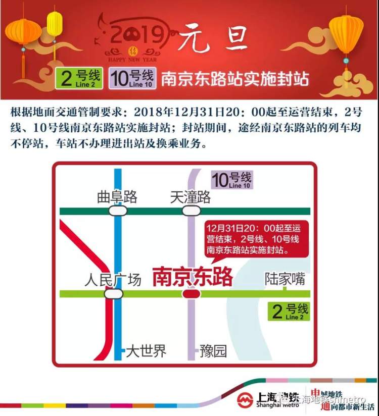 为配合做好市中心商业区域的客流疏导,根据地面交通管制要求,2、10号线南京东路站将于12月31日当晚20:00至运营结束,实施临时封站,封站时段内在南京东路站不能上下车。届时,车站将加强站内广播宣传、导向设置、站台站厅秩序维护等工作。