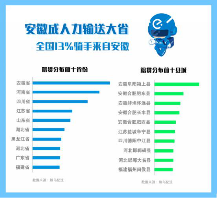 除了连接社区,骑手还带动区域间的发展。蜂鸟大数据显示,47%骑手来自中部地区,35%来自东部地区,18%来自西部地区。其中,安徽省是骑手输出大本营,全国13%的骑手都来自这里,其次是河南与四川,占比均在10%上下。