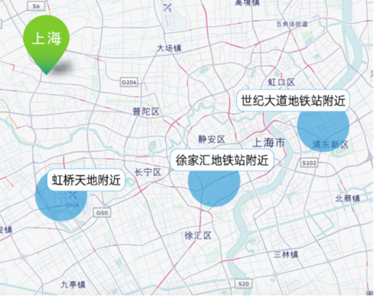 蜂鸟骑手所构成的即时配送基础设施,正在赋能每个城市形成自己的数字经济商圈。从外卖骑手的工作路径中,可以看出不同城市最活跃的数字经济地带。以上海为例,虹桥天地、徐家汇和世纪大道周边是本地生活服务最活跃的商圈。这与人们印象中的人民广场、南京西路繁华地带略有不同,每一座城市正在诞生数字化升级后的新商圈。