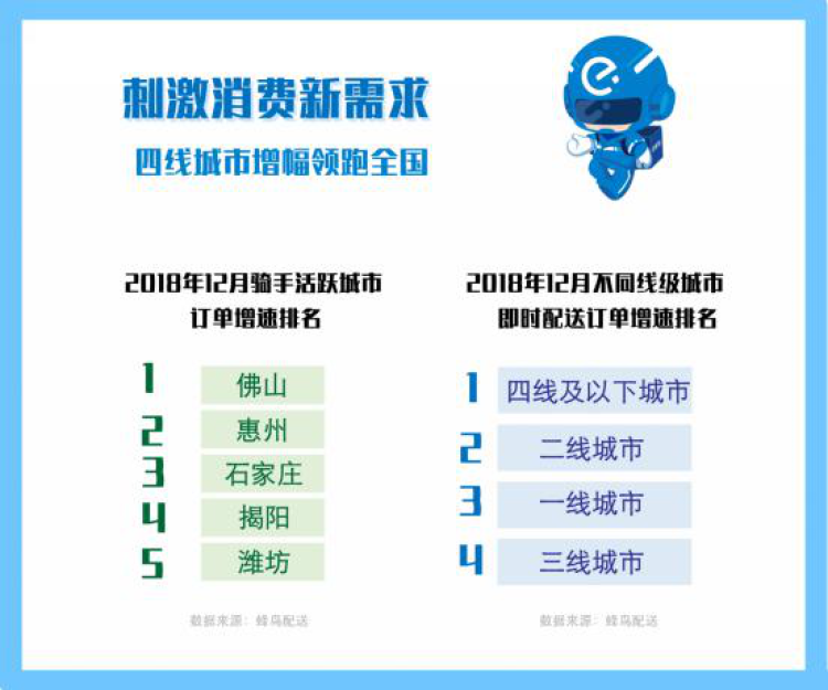 从一线城市到四线及以下城市,蜂鸟骑手提供的全域配送服务提振了区域消费想象力。在今年双12口碑饿了么吃喝玩乐节,四线城市即时配送需求猛增超100%,领跑全国。更多四线及以下城市的消费者享受到了不输一线城市的物流体验。行业数字化与区域数字化互为拉动,促成了广大商户进阶到“门店+网店+配送仓”的新模式。