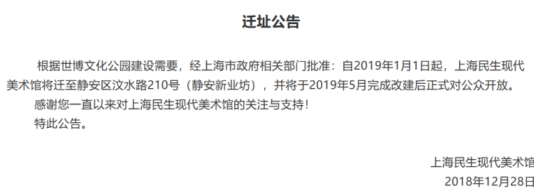根据世博文化公园公园建设需要,经上海市政府相关部门批准:自2019年1月1日起,上海民生现代美术馆将迁至静安区汶水路210号(静安新业坊),并将于2019年5月完成改建后正式对公众开放。