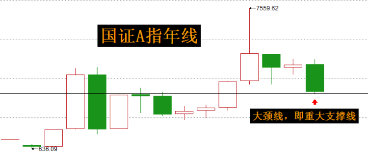 周到君从国证A指的年线图发现,技术上,当下股指已经运行至大颈线(见下图),预示股市已经大概率跌无可跌。