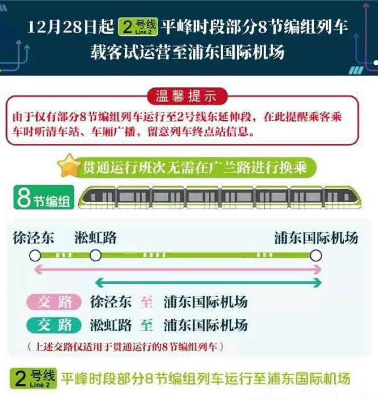 由于仅有部分列车运行至2号线东延伸段,乘客可注意听清车站、车厢的广播,留意列车终点站信息。将来待各方面条件成熟后,2号线东延伸段将全部采用8节编组列车载客运营,从而完全实现徐泾东站、淞虹路站往浦东机场方向的直接贯通,提升2号线全线运能,更加方便市民乘客出行。