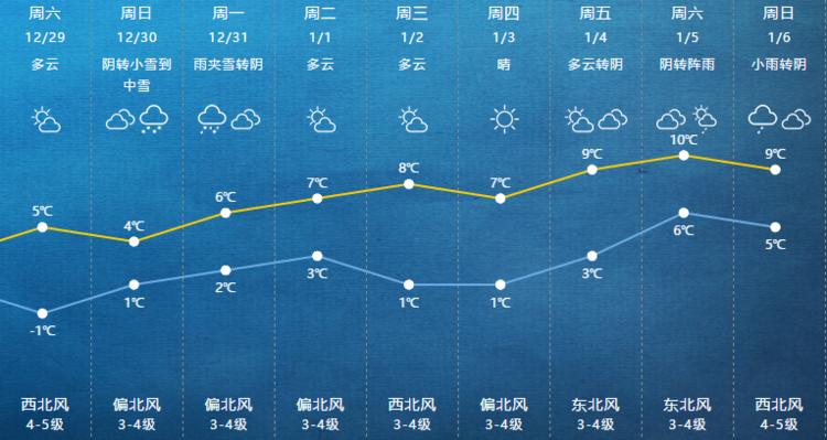 12月30日 阴转阴有小到中雪或雨夹雪,1~4℃。