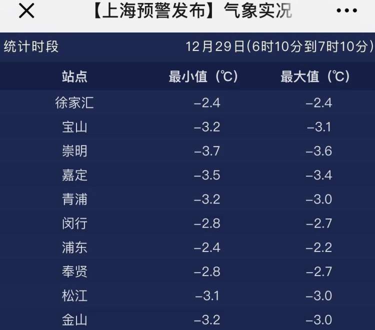 ■上海各区7点左右瞬时温度,约在-3~-0.5℃!