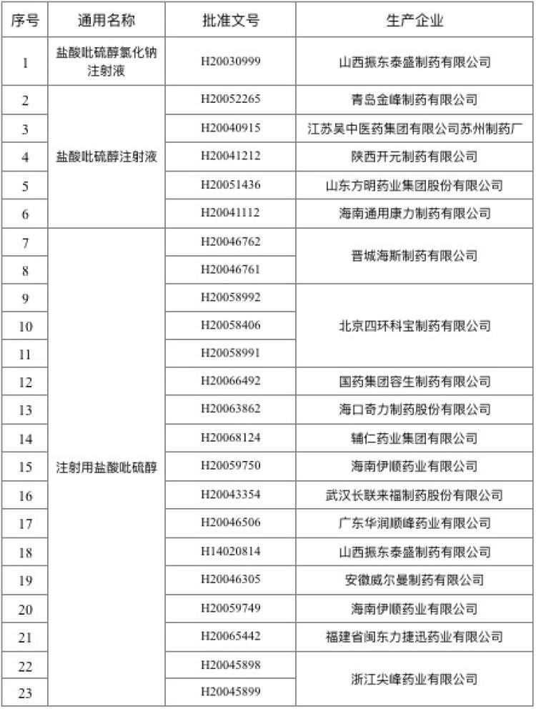 吡硫醇注射剂生产企业名单