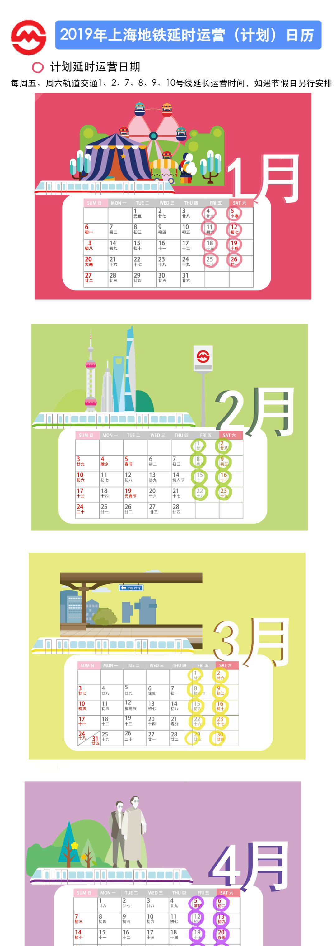 收藏!上海地铁2019年延时运营(计划)日历公布! 上海地铁shmetro 2019-1-01 来源:周到上海 2019年到了,上海地铁的延时运营计划如何? 申通地铁集团公布了新一年度延时运营(计划)日历,每周五、周六轨交1、2、7、8、9、10号线延长运营时间。PS:如遇节假日另行安排。 快戳图收藏吧,周末晚归再也不用担心赶不上末班车了! 来源:周到上海 作者:上海地铁shmetro 赞一个 (0)