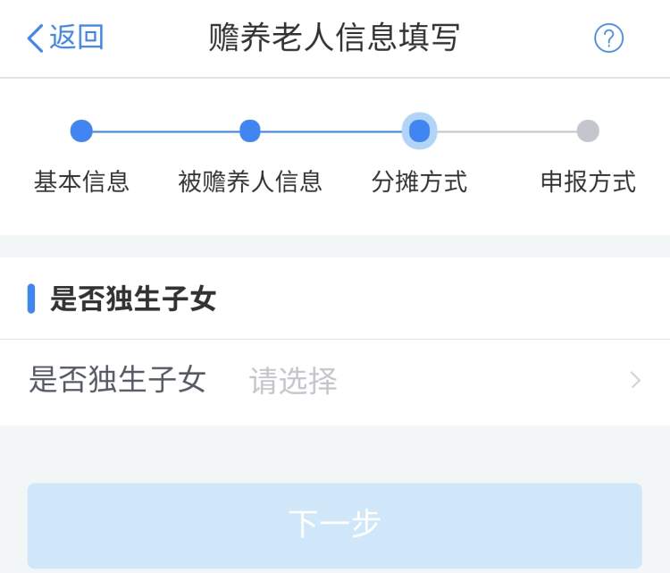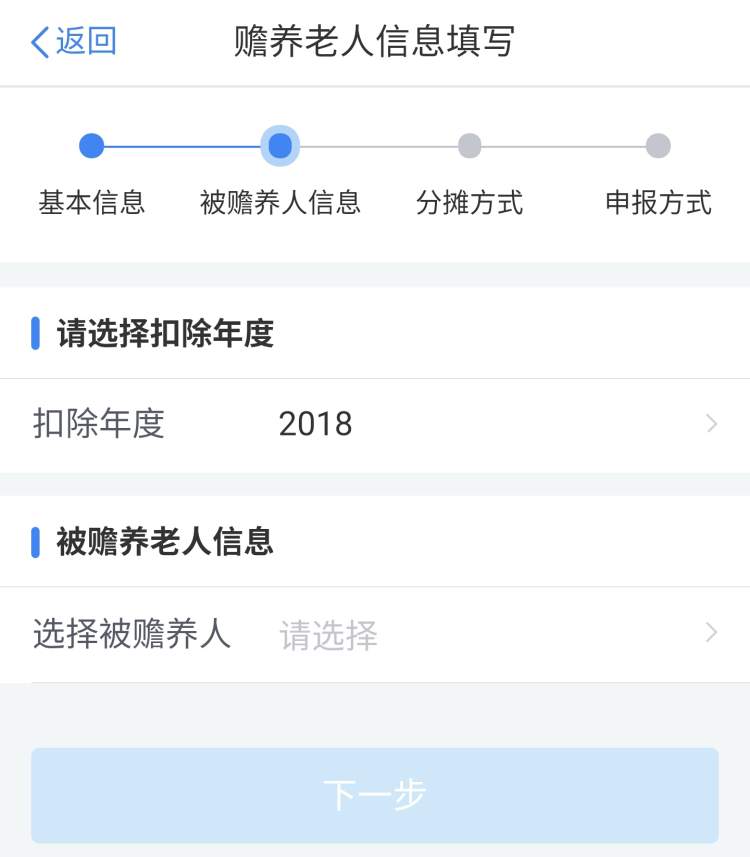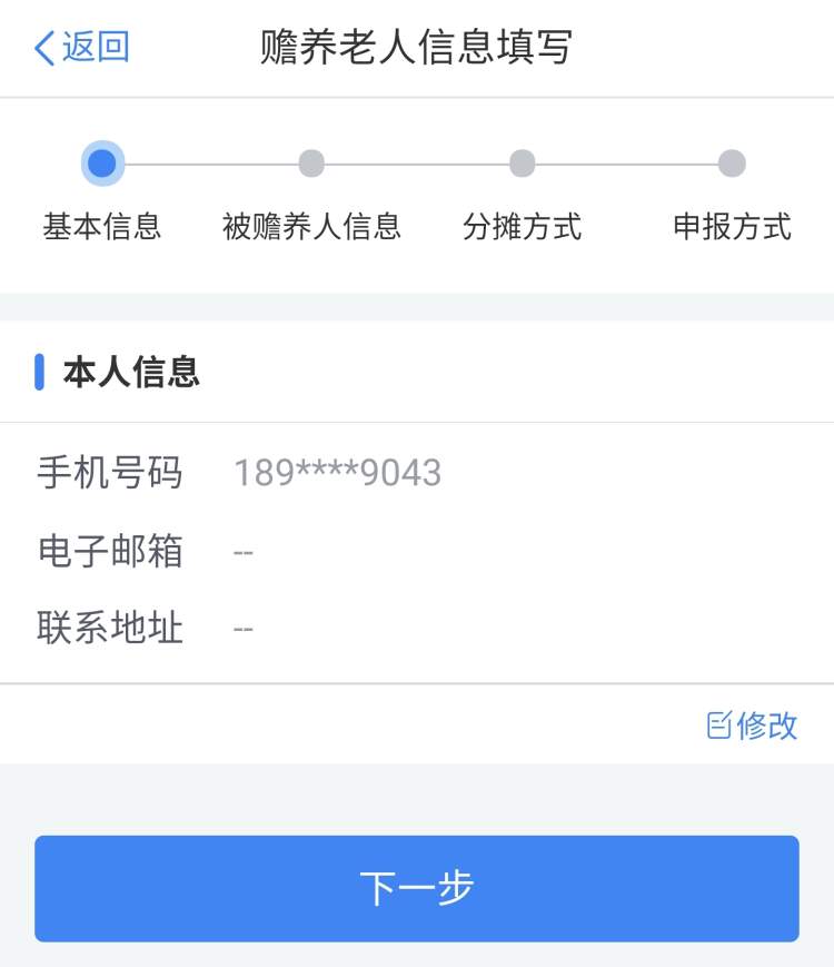 以“赡养老人”为例,共有基本信息、被赡养人信息、分摊方式、申报方式4步。基本信息可以选择补充电子邮件、联系地址。