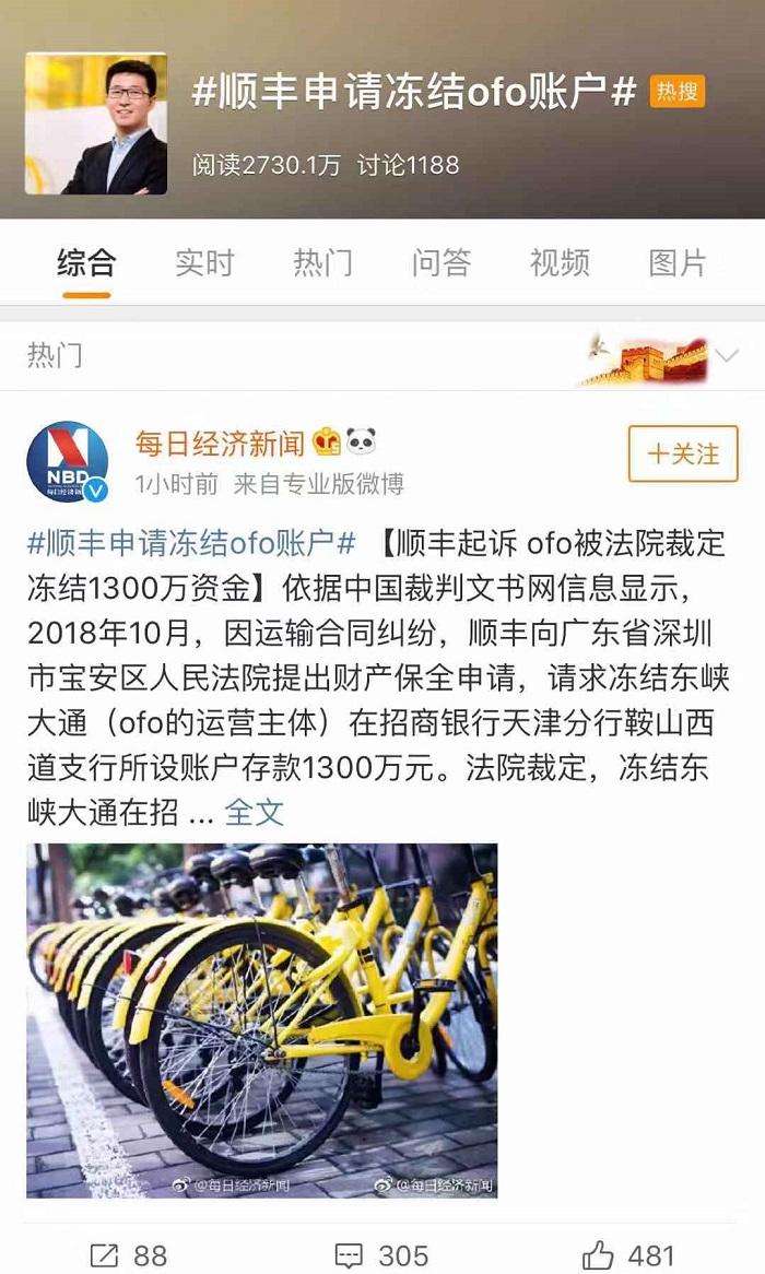 截至1月2日10:30,微博上关于#顺丰申请冻结ofo账户#的话题已达到阅读量2730.1万,讨论量1188条。