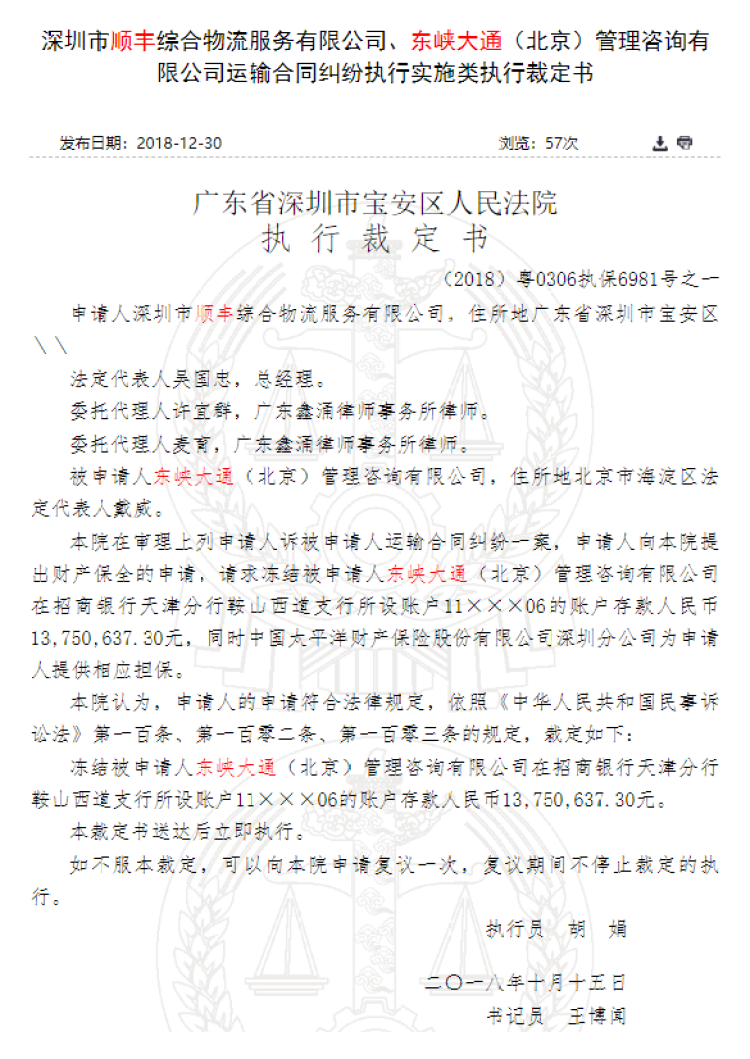 法院裁定,顺丰的申请符合法律规定,冻结东峡大通在招商银行天津分行鞍山西道支行所设账户存款13,750,637.30万元。