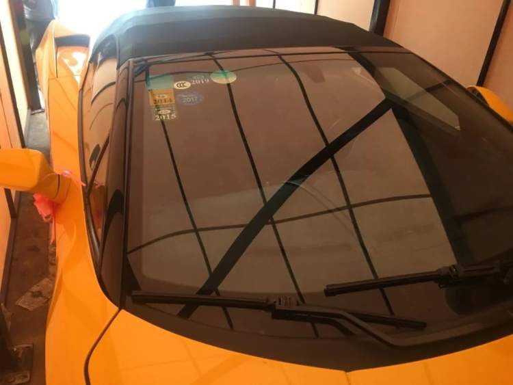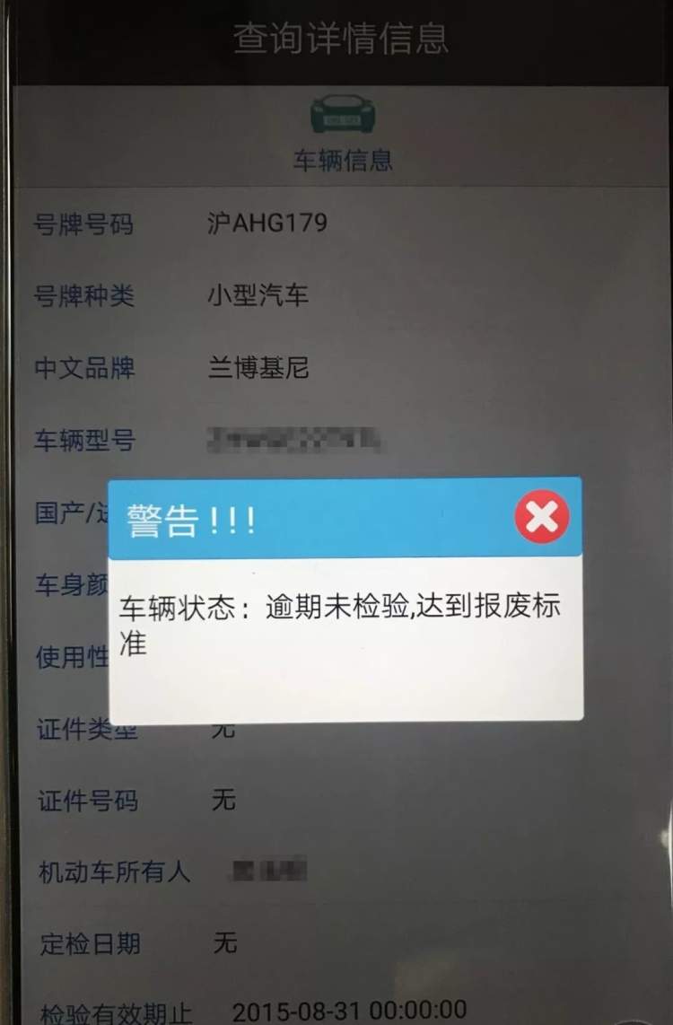 一辆牌号为“沪AHG179”的黄色兰博基尼跑车,查处时发现车辆因2015年至今未验车,已处于“逾期未检验,达到报废标准”状态,但该车前挡风玻璃上还贴着“2017年交强险标志”、“2019年车辆检验合格标志”。