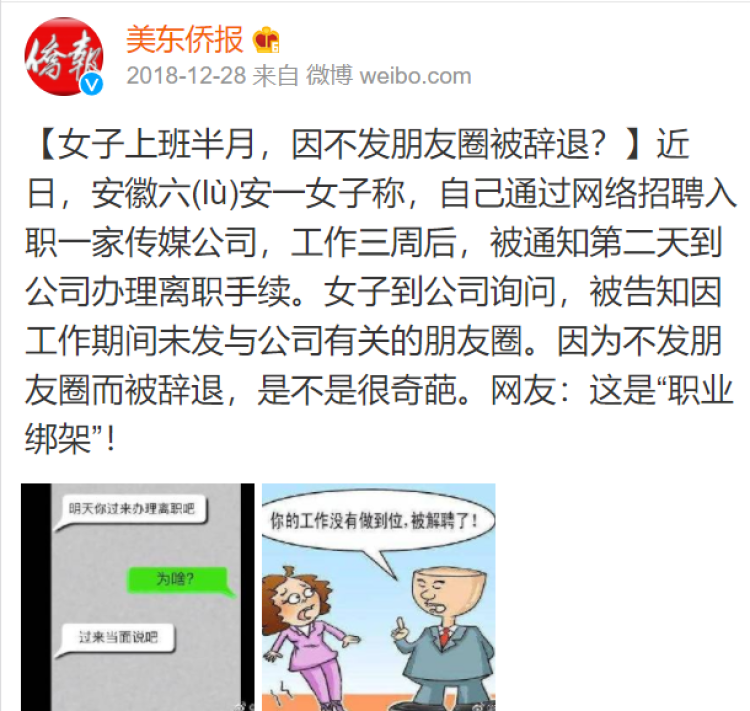 最近,有位倒霉姑娘因为半个月没在朋友圈发跟公司相关的文章被单位开除!
