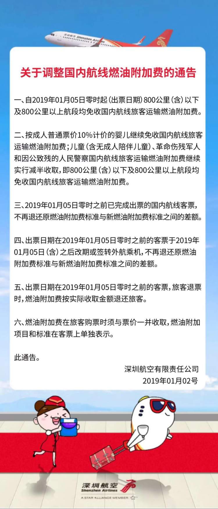 今天(1月2日),深圳航空发布《关于调整国内航线燃油附加费的通告》。通告称,自2019年01月05日零时起(出票日期) 800公里(含)以下及800公里以上航段均免收国内航线旅客运输燃油附加费。预计其他航司也会陆续发布公告,这对于春节出行的旅客来说无疑是一个好消息。
