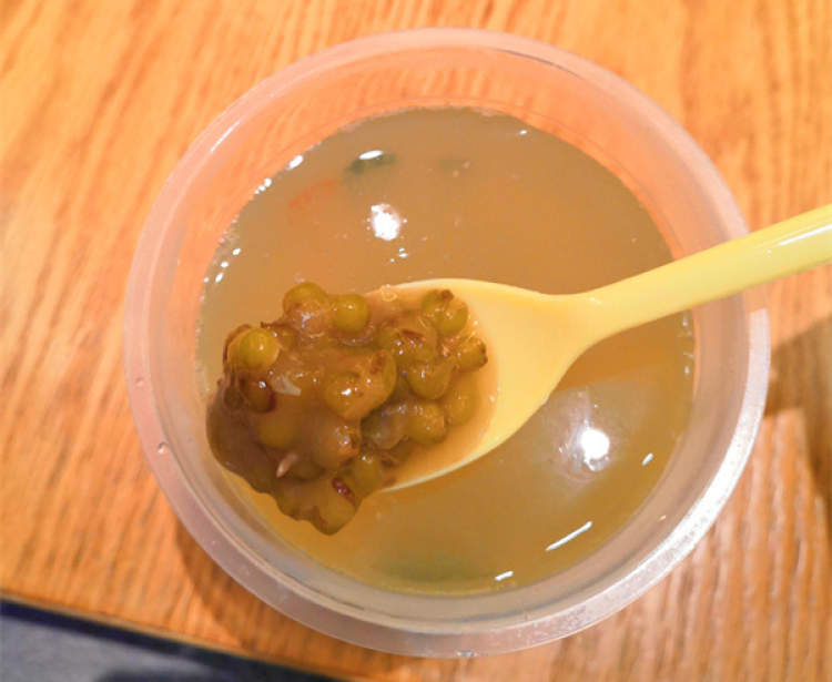 这家的绿豆汤是冲调出来的,听到这里可能有些人会觉得失望,但是这不影响它的味道。店员介绍,他们事先将绿豆经过蜜制,让甜味充分进入绿豆中。虽然绿豆汤是冲出来的,但是味道却也不逊色于煮出来的,绿豆十分酥软,味道甜而不腻,也没有绿豆壳,十分爽口。