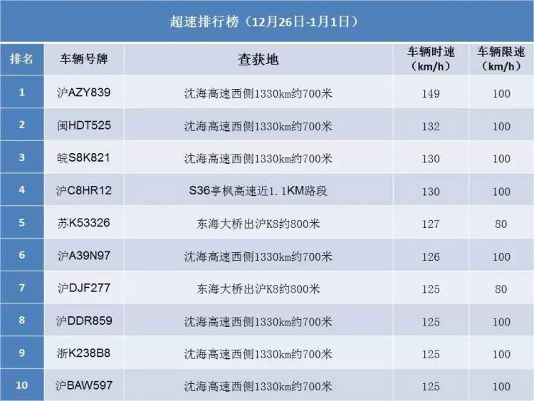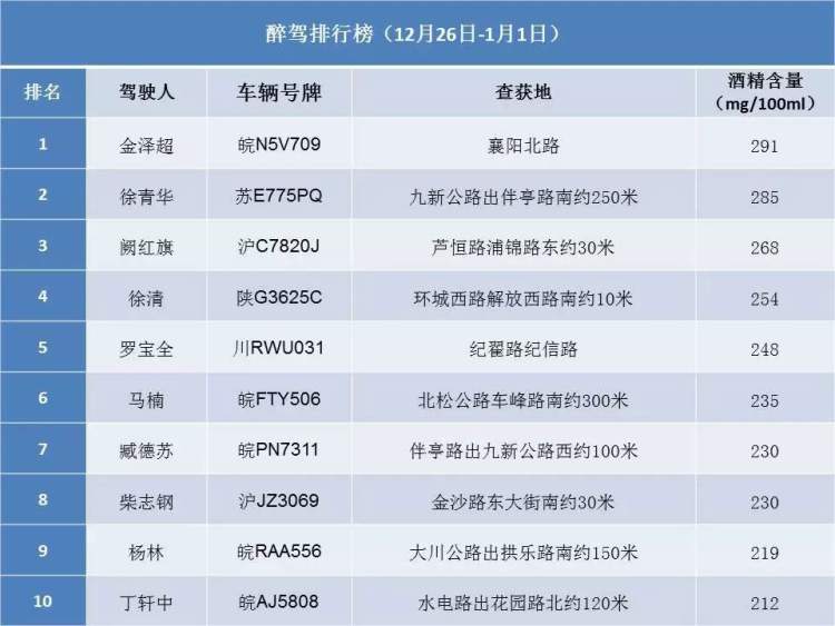 上海交警曝光上周十大醉驾、超速名单:酒精含量最高达291mg/100ml 荣思嘉 2019-1-02 来源:周到上海 为进一步落实公安部交通管理局冬季道路交通事故预防专项行动和“百日安全行动”,上海市公安局交通警察总队严整严治酒后驾驶、超速驾驶等严重交通违法,现就近期查获醉驾、超速名单进行公开曝光,以警醒交通参与者。 十大醉驾名单 十大超速名单 来源:周到上海 作者:荣思嘉 赞一个 (0)