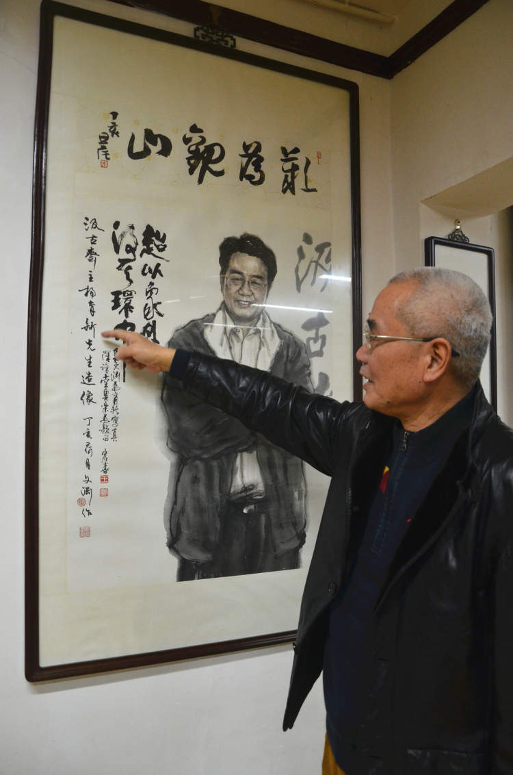 在汲古斋二楼的墙上有一幅杨育新的素描,国字脸,粗剑眉,如意鼻。挺直的鼻梁上,驾着金丝边眼镜,透出几分雅气;黑里透红的脸膛神采飞扬,透出几分刚气;逢人爱笑的嘴唇向上咧开,透出几分喜气。乍一看,他是个乐天派,仔细一瞧,眉字间的川字纹,铸刻着蹉跎岁月、坎坷人生、传奇经历……
