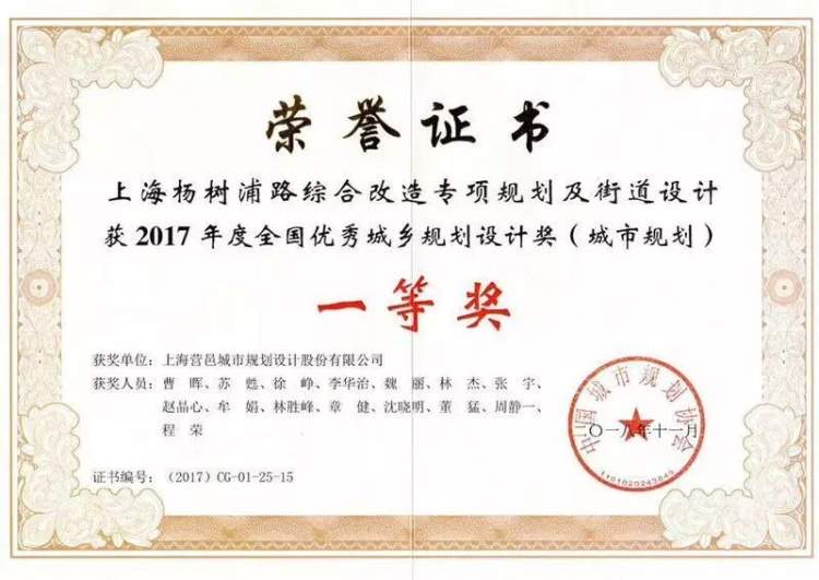 全国城乡规划设计奖每两年评奖一次,历届得奖的基本上都是大型项目。翻开2017年度的获奖名单,“北京城市总体规划”、“上海城市总体规划”、“广州总体城市设计”、“京津冀城乡规划”“黄浦江两岸公共空间贯通开放规划”等赫然在列,相较于这些以城市为背景的大型规划,杨树浦路是其中格局最小的一个。
