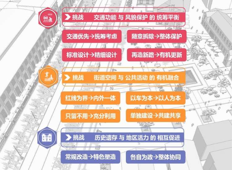改变道路改扩建对两侧建筑随意拆除的模式,对区域历史建筑进行“地毯式”摸底调查和价值评估,梳理出道路沿线历史建筑并进行整体保护,改造后大部分建筑得到原址保留。
