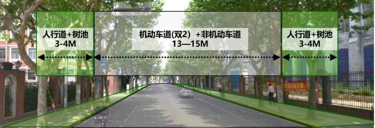 改变以机动车需求优先为导向的建设模式,统筹考虑交通与风貌保护,在确保基本交通功能的基础上,将杨树浦路从原规划的双向六车道缩减至双向四车道,通过将行道树设置在机动车道与非机动车道之间保留了大部分现状法国梧桐行道树,基本保留延续了杨树浦路60-75英尺的百年街道尺度感受。