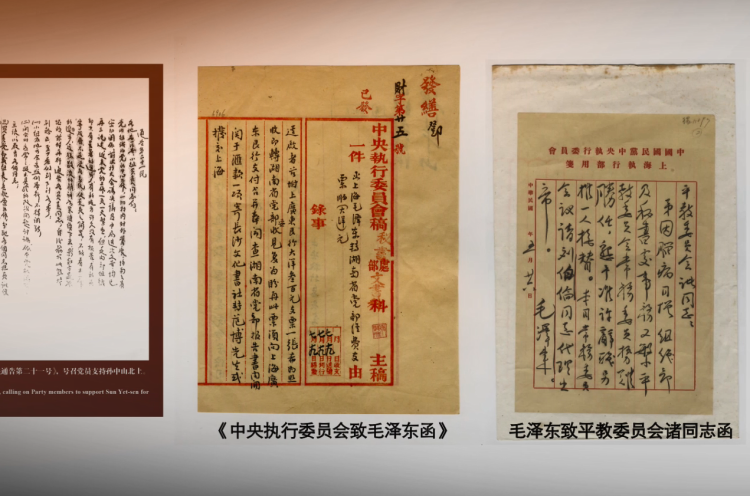 展出的信件包括毛泽东手迹《毛泽东致平教委员会诸同志函》等。文件有《国民党上海执行部第一次至第四次执行委员会会议会议记录》、1924年3月《上海执行部办事通则》、1924年3月《上海执行部通告》第一号、1924年3月21日《上海执行部通告》第五号、《中国国民党上海执行部平民教育委员会简章》、1924年3月国民党上海执行部工作人员薪资手册等。