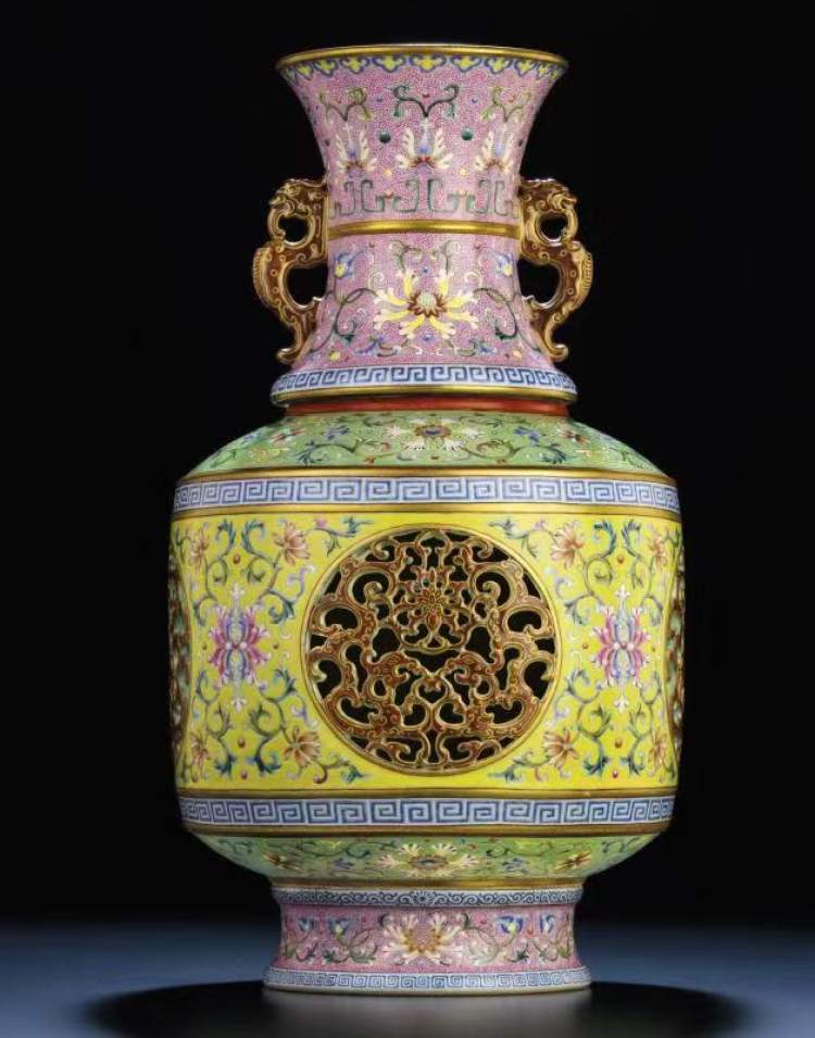 ▲清乾隆粉彩时时报喜转心瓶,高38.1厘米,龙美术馆藏