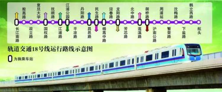 在建轨交18号线可与十几条“兄弟”线换乘,堪称又一“换乘王”,它始于宝山区长江南路站,终于浦东新区的航头镇,全长约36.8公里,设车站26座,全部为地下线,是一条位于市东部南北向轨交线。