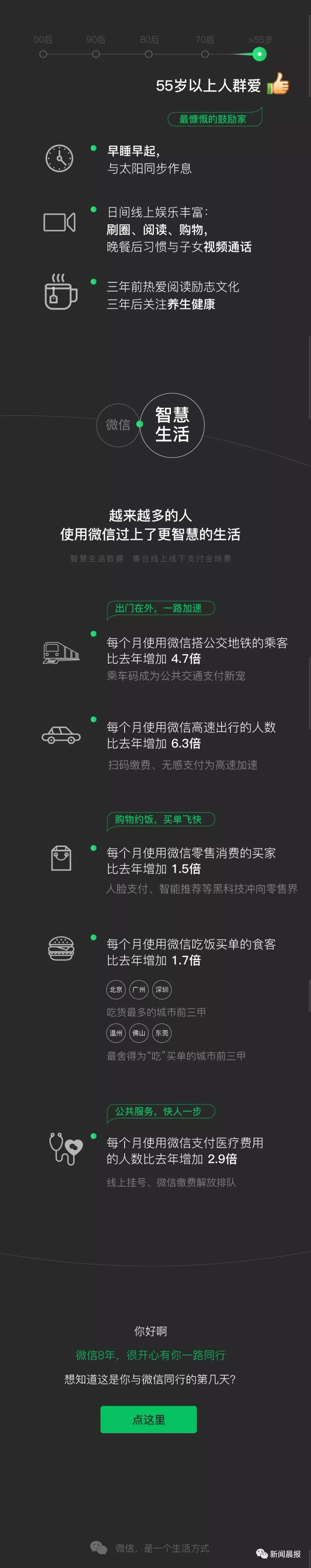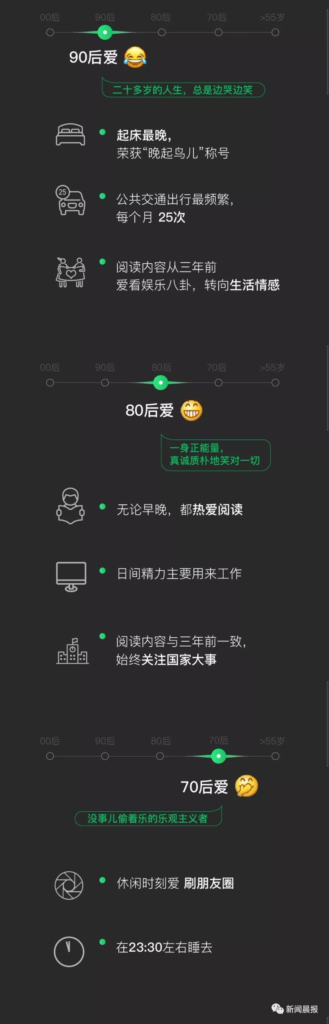 微信大数据来了!00后最爱熬夜,90后最爱赖床,80后扎心了 杨晓凤 2019-1-09 来源:周到上海 来了,2018年微信数据新鲜出炉, 你到底是00后的小鲜肉 还是55岁的老腊肉, 看图自测一下就可见分晓了↓ 看完这组微信表情大数据, 网友纷纷晒出了自己爱用的表情包, 还有网友是00、90随机变 好了,都看到这里了, 是时候亮你们日常最爱用的表情包 证明自己还年轻了 来,晨报君先来↓ 最后就等各位砸表情包了 来源:周到上海 作者:杨晓凤 赞一个 (7)