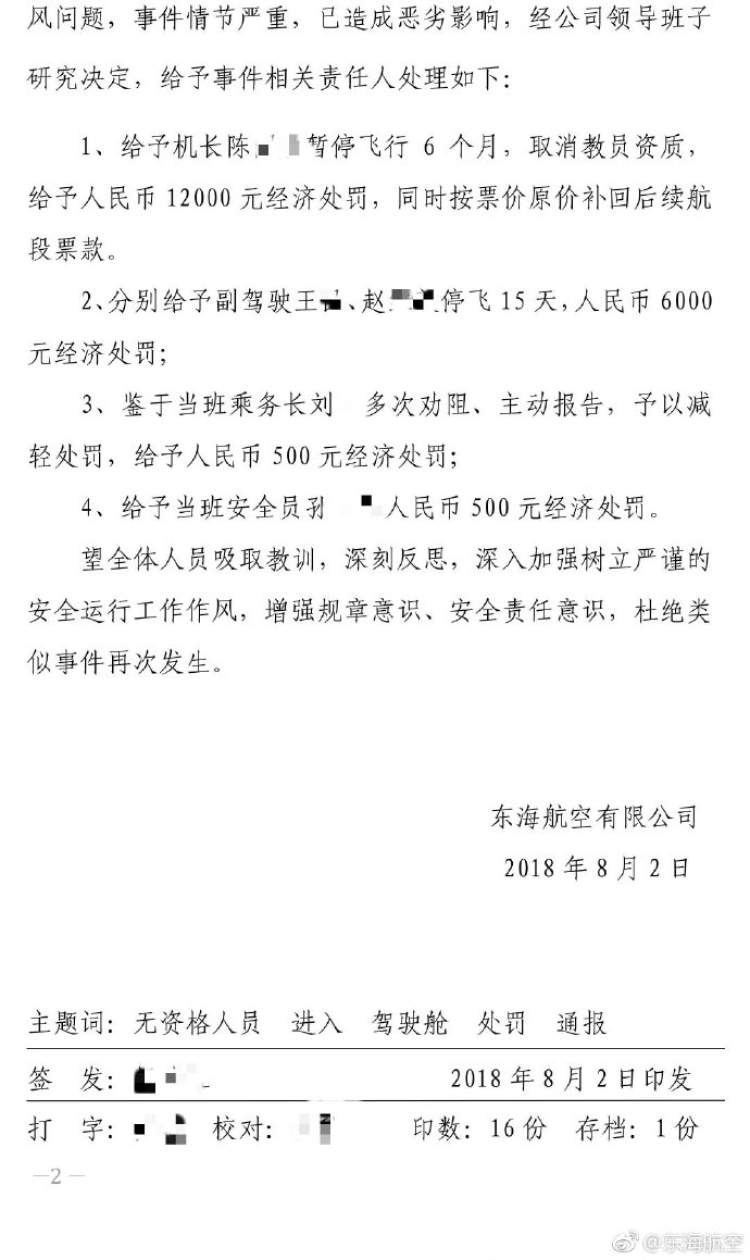 今天下午,东海航空在其官方微博发布公告说,该女乘客为机长妻子,机长被停飞6个月,取消教员资质。