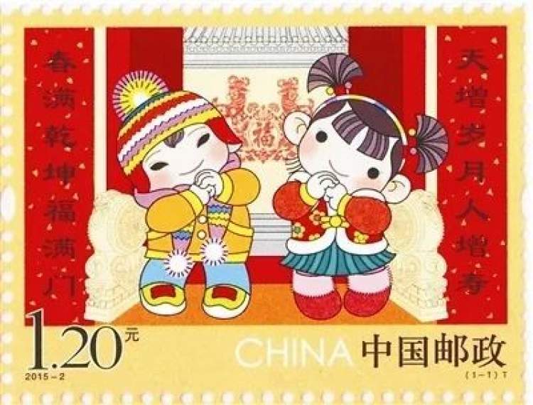 中国邮政从2015年开始发行《拜年》系列邮票,通过两个活泼可爱的娃娃形象向全国人民拜年的方式进行创意设计。这两个年味十足的萌童取名“欢欢”和“喜喜”,也是在采纳了广大集邮者意见,通过网络征集后命名的。