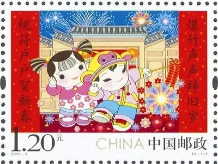 2016年发行的《拜年》邮票(图二),延续了2015年邮票的风格,年味突出。