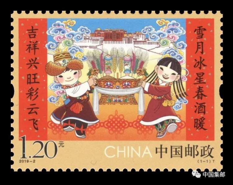 2017年是内蒙古自治区成立70周年,当年发行的《拜年》邮票(图三),第一次加入少数民族的内容。邮票上,拜年娃娃“欢欢”和“喜喜”身着内蒙古少数民族服饰,献哈达、迎新春、拜大年,背景有雪地、蒙古包和祥云,画面清新明媚,吉祥喜庆。