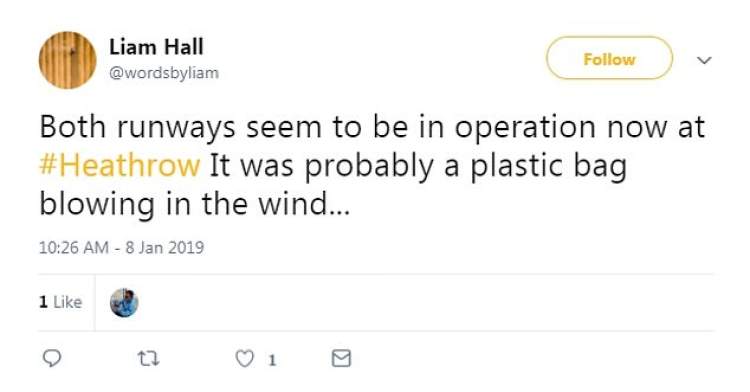 还有网友称,这次希思罗机场说不定是反应过度了,很可能所谓的无人机,只是“一个在风中飘荡的塑料袋。”