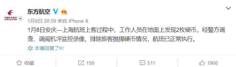 昨晚,东方航空在微博发布公告称,1月8日安庆至上海航班上客过程中,工作人员在地面上发现2枚硬币。不过经警方调查、调阅机坪监控录像后,排除了旅客抛掷硬币的情况。航班已正常执行。