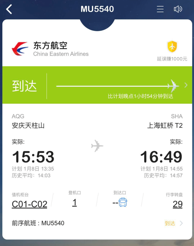 飞常准的信息显示,由空客320执飞的MU5540最终晚点2小时18分钟从安庆起飞,于当天16:49抵达上海虹桥机场。