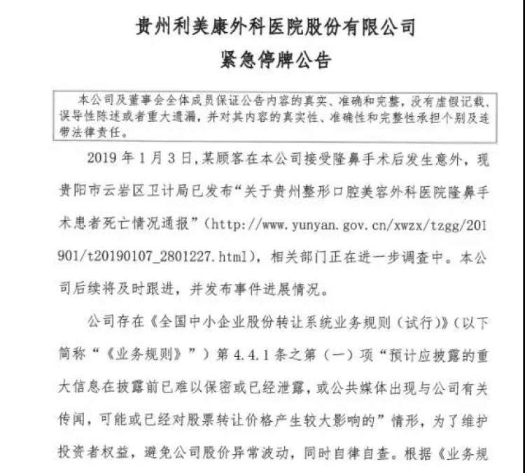 近日,贵州一名19岁女大学生夏某在隆鼻手术中疑因麻醉并发症抢救无效去世,引起关注。涉事医院贵州利美康外科医院的母公司贵州利美康外科医院股份有限公司(利美康)被推上风口浪尖。贵州利美康外科医院称,死因是术后出现麻醉并发症“恶性高热”,不过目前仍未有司法鉴定结果。1月7日,在新三板挂牌的利美康紧急停牌,因“预计应披露的重大信息在披露前已难以保密或已经泄露,或公共媒体出现与公司有关传闻,可能或已经对股票转让价格产生较大影响”的情况。