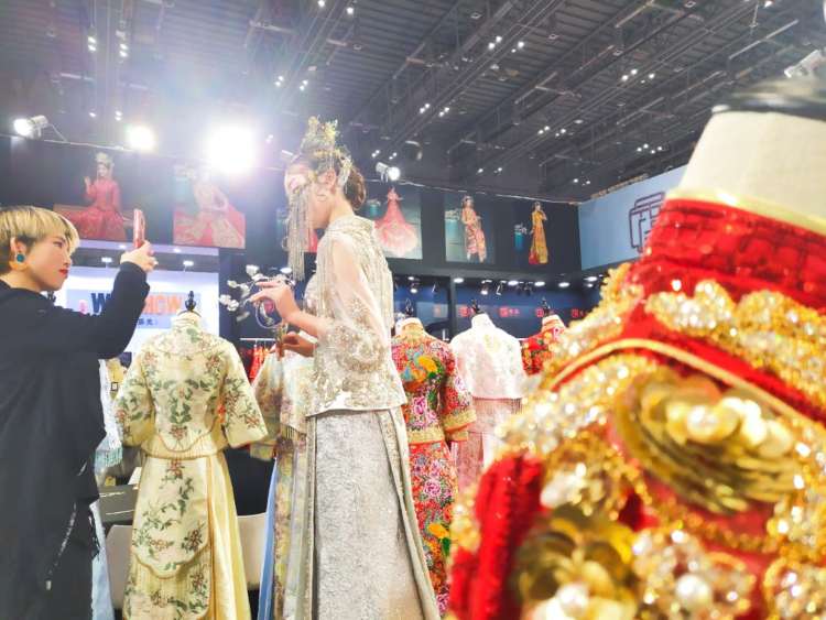 在展会现场,成千上万款婚纱礼服在位于3H馆的“上海国际婚纱礼服、彩妆造型及时尚配饰展”上进行展示,即将步入婚姻殿堂的新人们可以一站式挑选来自全球各地的婚纱礼服。