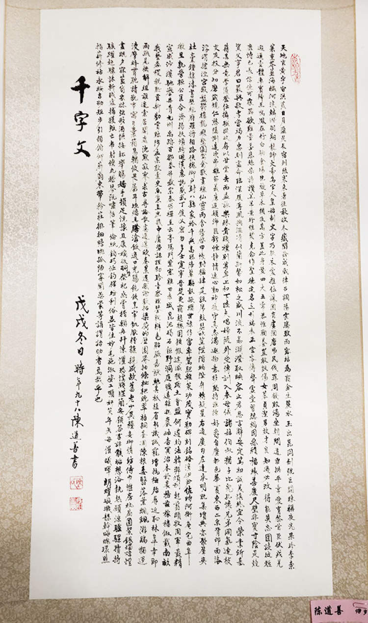 另一幅《千字文》更是让人叹为观止。陈老平时都戴眼镜,但一到写书法,他习惯摘掉眼镜写,而且写书法的速度飞快,一般人还真比不上。听施老师讲,作品上密密麻麻的书法字,都是老人用写福字这样的粗笔写成。陈老的这个绝活,就是用粗毛笔既能写“大”字,又能写“小”字。